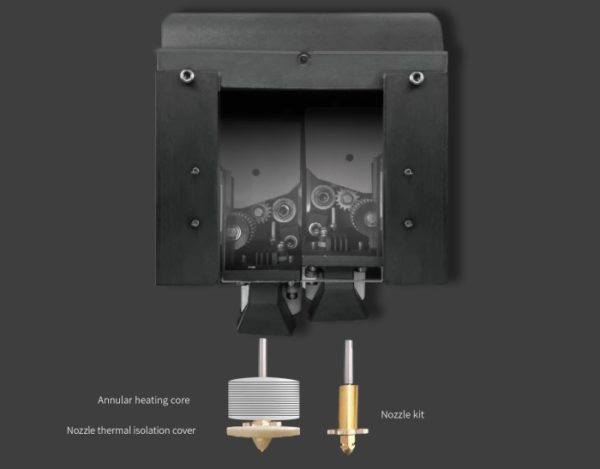 - Double extrusion, impression bicolore, impression double avec matériaux de support, prise en charge de différentes exigences d’impression.