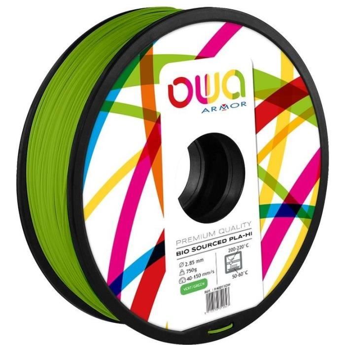 Le filament pour imprimante 3D OWA PLA HI Hight Impact est bio-sourcé et fabriqué en France, vert néon en 2,85mm de diamètre.